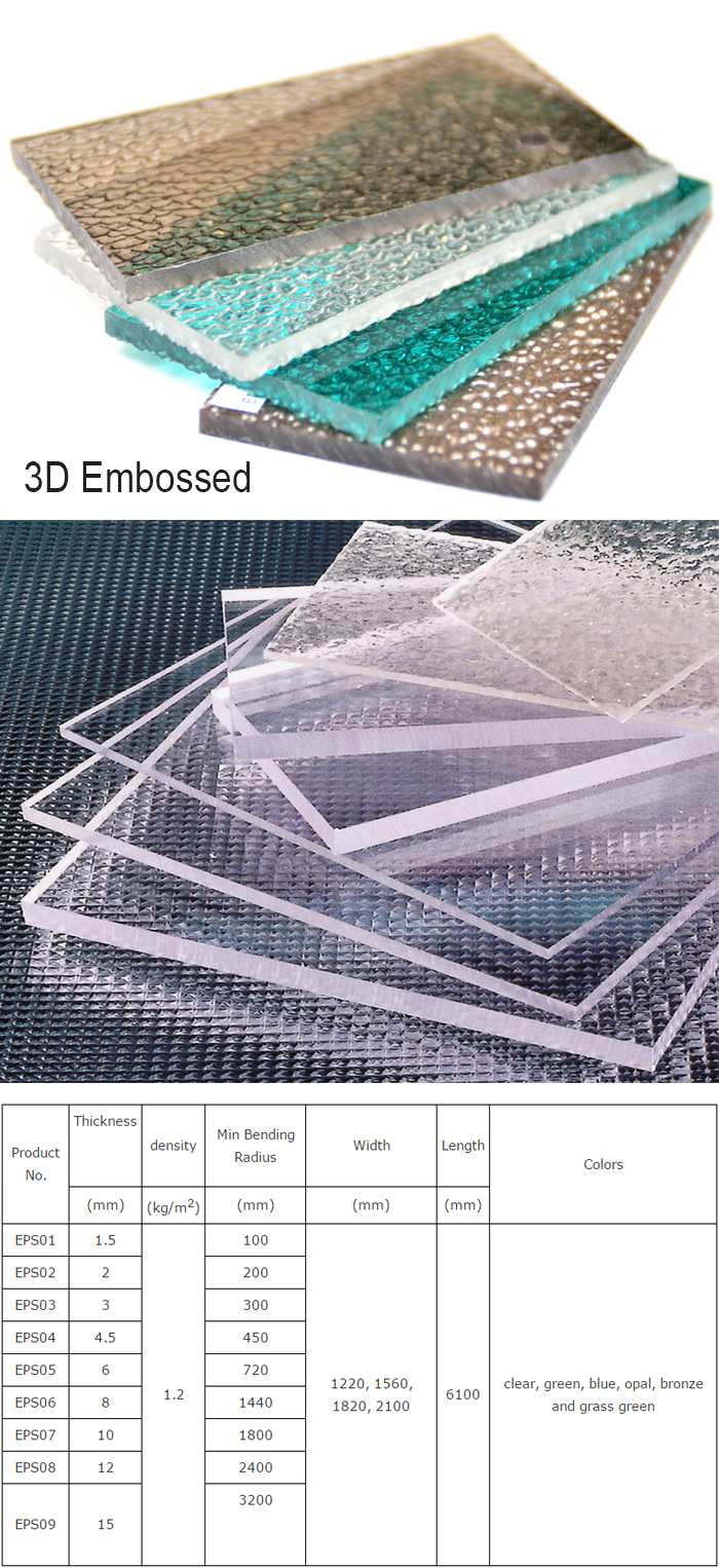 Embossed polycarbonate sheets are primarily used as decorative materials for its unique surface, light weight and unbreakable.