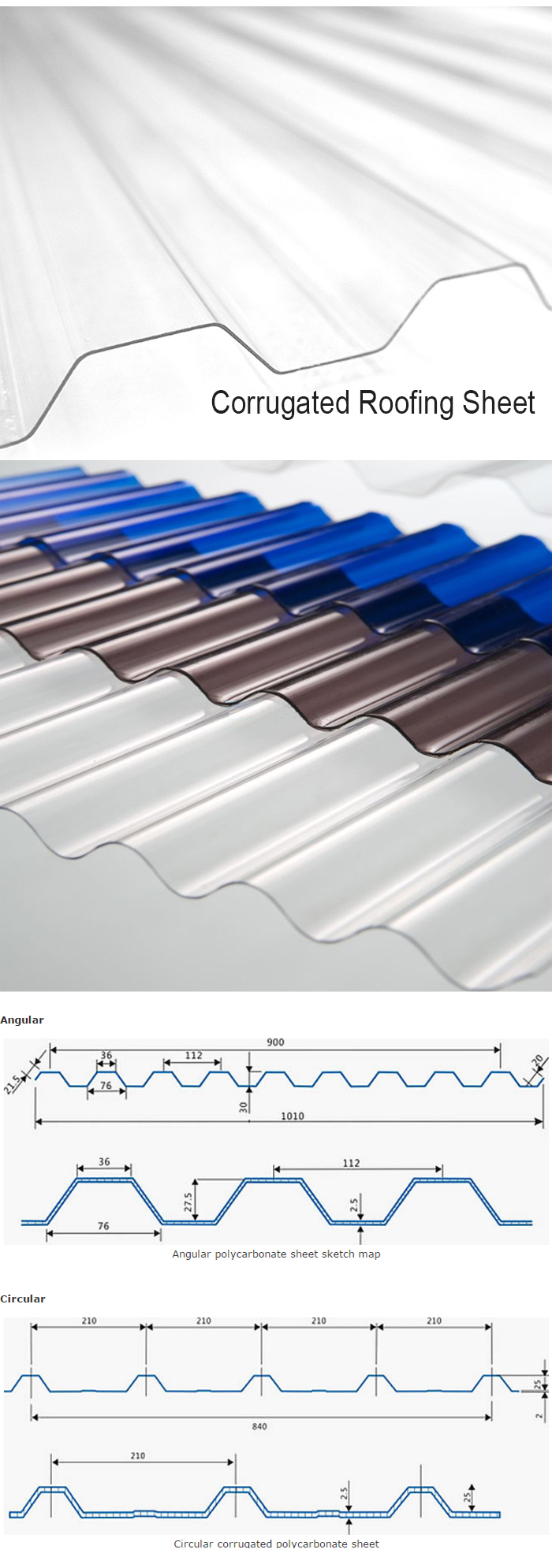 Corrugated polycarbonate sheets feature corrugated surface and self-supporting structure. Self-supporting structure requires less glazing bars decreasing total load of the greenhouse and save installation cost significantly. In contrast to flat polycarbonate sheet such as twin-wall or solid sheets, corrugated sheet can control and adjust the light transmission by changing the direction of the light, allowing for more sunlight for the plants in the morning and evening.