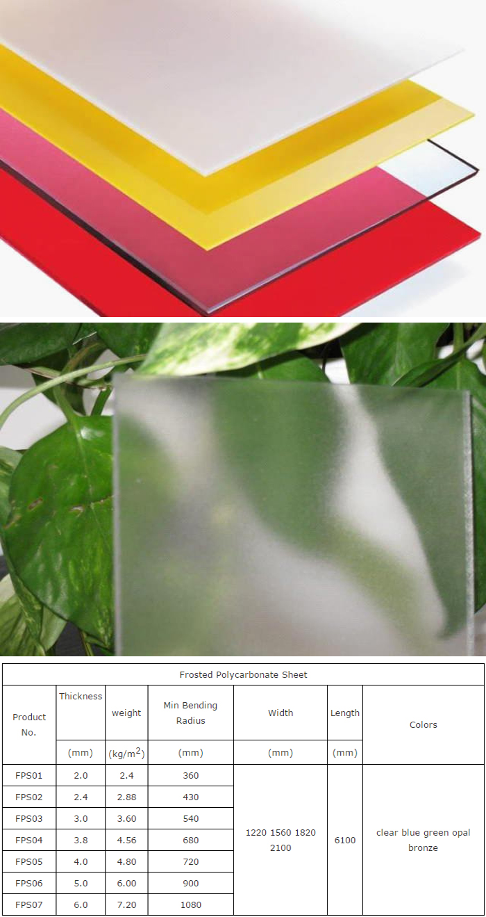 Frosted polycarbonate sheet, another edition of solid polycarbonate sheet, is covered by fine particles. While light transmitting frosted surface, scattering and diffuse reflection happens and make the light soft and uniformly distribute. Hence, frosted polycarbonate sheets are extensively used in lighting filed as a main contributor of creating a hazy, elegant and romantic atmosphere.